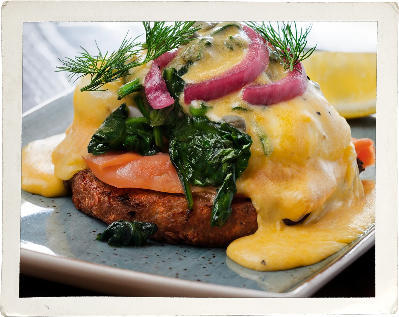 crispy potato, poached eggs, greens, horseradish cream cheese, dill & caper hollandaise, pickled red onion.