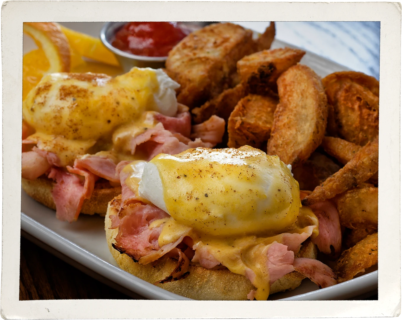 toasted english muffin with a freshly cooked farm fresh egg, cheddar cheese and a touch of our house made hollandaise. comes with your choice of bacon, ham or maple chicken sausage.